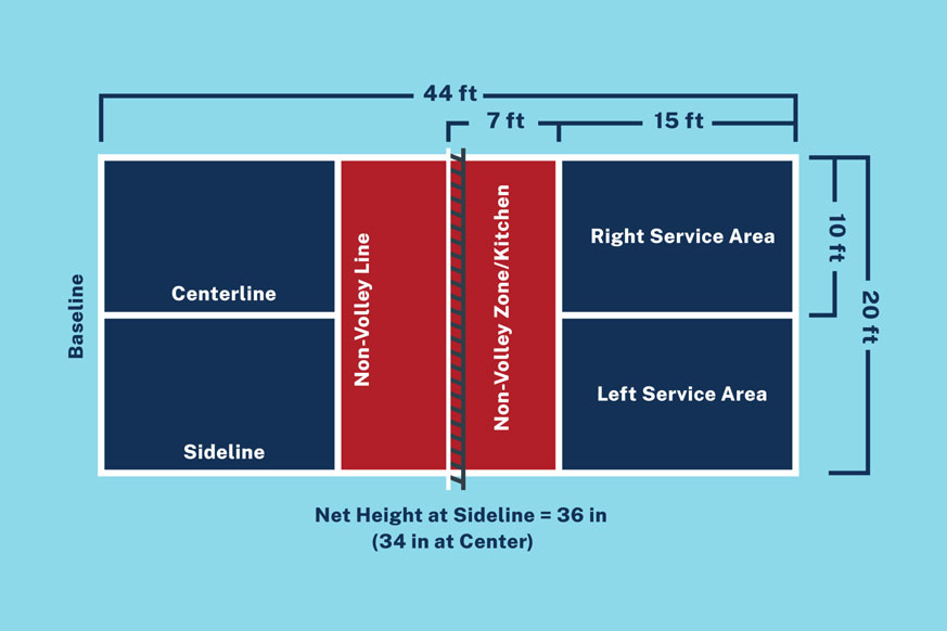 Zona Non-Volley (The Kitchen): Area sepanjang 2,13 meter (7 kaki) dari net di kedua sisi lapangan di mana pemain dilarang melakukan pukulan volley (memukul bola tanpa memantul).